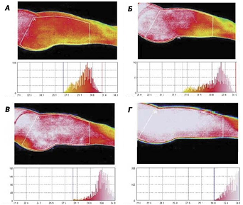 Рис 8. Термограммы латеральной части бедра пациента с целлюлитом до начала первого вибрационного воздействия (А), через 10 мин после его окончания (Б), до начала 20-го сеанса (В) и через 10 мин после (Г) [9]